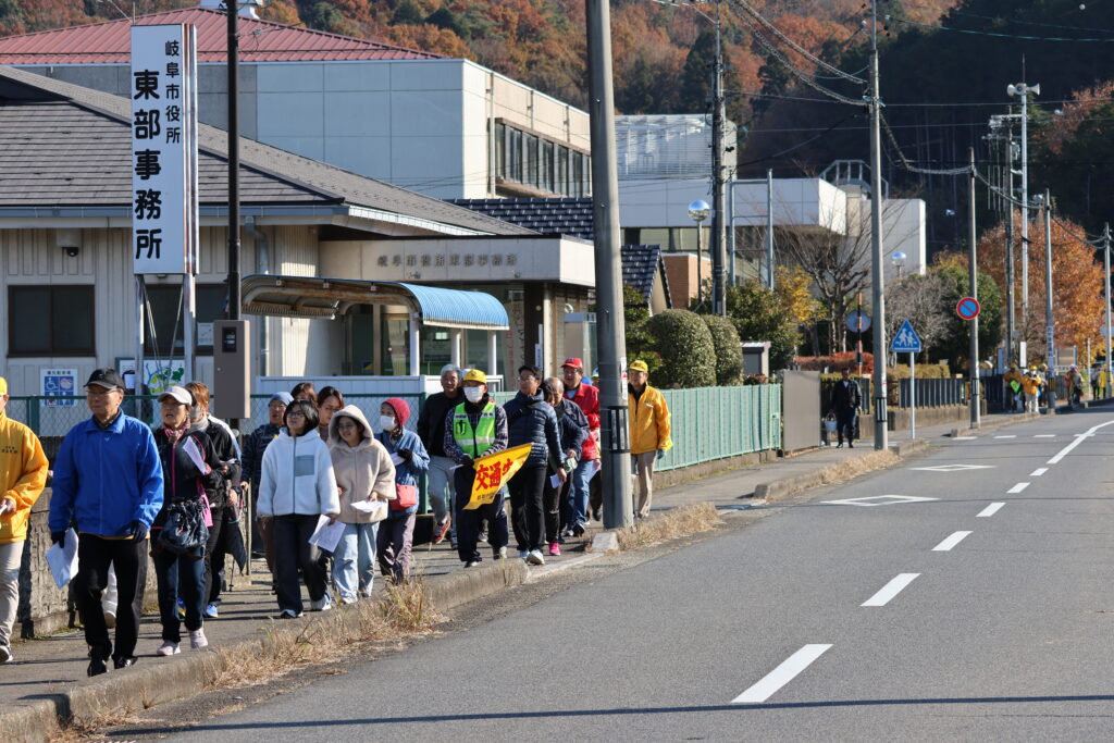令和7年12月7日ウォーキング大会が開催され、今回は芥見岩っこバスのルートを大人から子供まで約70名の参加者が完歩しました。はじめに渡された問題の答えを、チェックポイントの各バス停で見つけながら歩くクイズラリー形式でおこなわれました。山の木々が色づいた葉を落とし始めた初冬の一日を楽しみました。